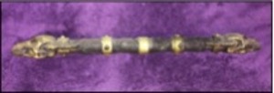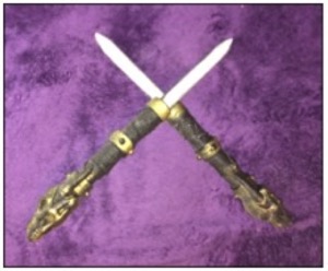 The weapon of the Drachenklaue style appears to be a wooden rod, banded with an alloy of dracheneisen and brass and capped at either end with a stylized drachen’s head. While this appears to be a heavy weapon such as a mace, when pulled apart it is revealed to be a pair of short-bladed, pommel-heavy knives which ingeniously fit together, each blade sliding into a slot in its mate’s hilt. Whether joined together or separated into its component blades, the weapon is meant to be used aggressively and in tandem with the wielder’s body to quickly dispatch enemies of the order who (for whatever reason) do not merit a formal sanction and declaration of hostility.